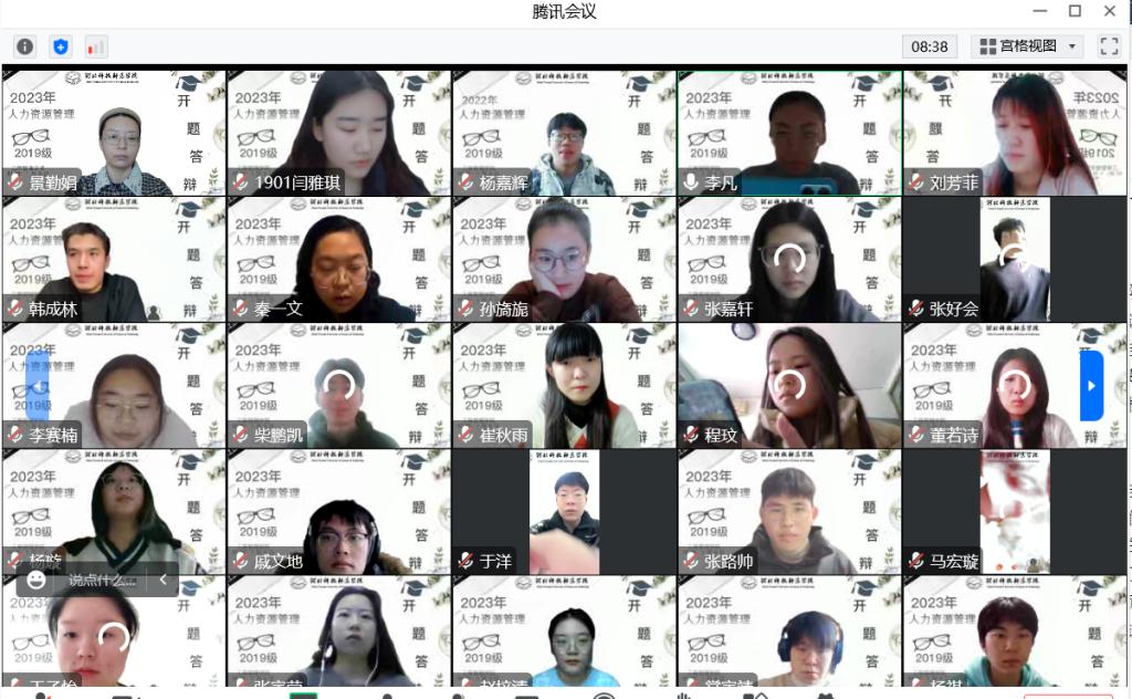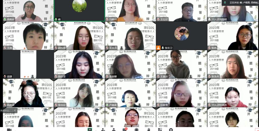 2023年1月9日,人力资源教学部通过腾讯会议举行了2019级人力资源管理专业学生毕业论文开题答辩。开题答辩分为开题报告和答辩两部分。撰写开题报告是论文前期文献调研的聚焦点,对毕业论文的写作起到定位作用。而开题答辩是通过专业老师的评议判断确定论文的研究价值、研究方法是否恰当以及论文的写作逻辑是否存在缺陷。因此毕业论文开题答辩不仅是毕业论文工作中的重要环节,也具有非常重要的作用。