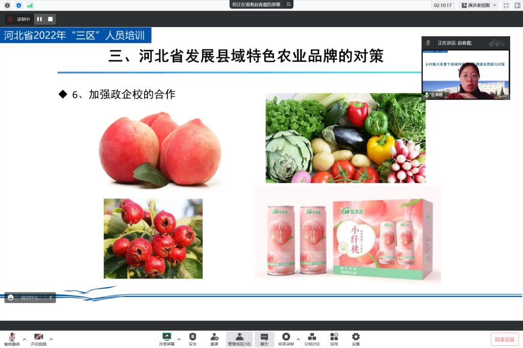 2022年11月18日,我院市场营销教学部专业带头人赵春霞博士受邀为我校承办的“河北省2022年三区科技人员培训班”进行了“乡村振兴背景下县域特色农业品牌建设思路与对策”的线上讲座。