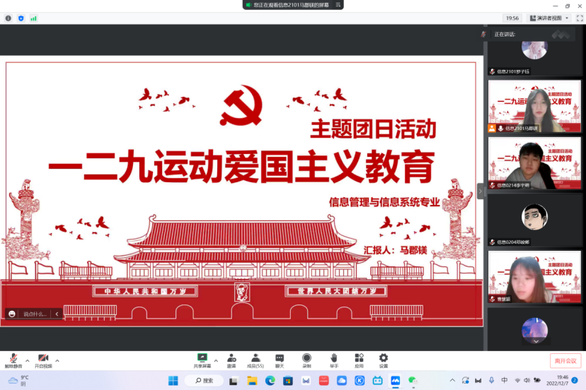 我院46个团支部,积极开展理论学习、主题朗诵、青年寄语等多种形式的团日活动,其中物流管理2201、2202、2203团支部饱含深情的主题朗诵,引领团支部成员身临其境地感受着时代使命感,坚定了青年学生的理想信念,将爱国主义情怀深植于心。信息管理与信息系统2101、2102团支部开展小组讨论,同学们各抒己见深入探讨当代大学生应该如何弘扬“一二九”精神。使同学们进一步理解“一二九”运动中彰显的青年学生勇于担当的民族精神,引导同学们增强历史责任感。