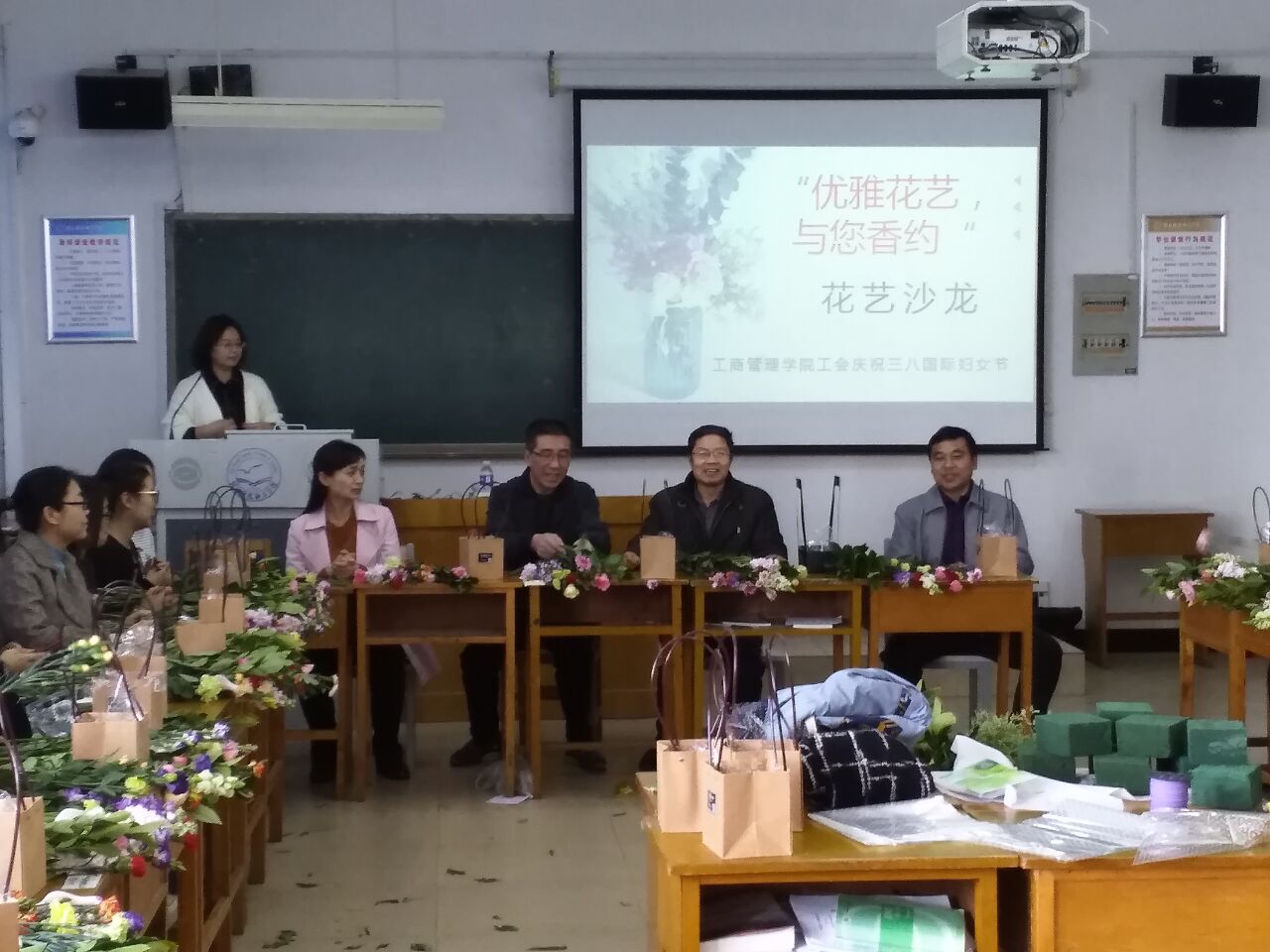 下午两点三十分,在逸夫教学楼A610准时开始。女老师们准时到场参加,满满当当的坐满了整间教室。花艺培训老师首先对花艺理论知识进行了简单介绍,包括插花的特点,有时间性,生命性,时尚性,装饰性;插花的基本分类,分东西方,现代古典,基本创意。