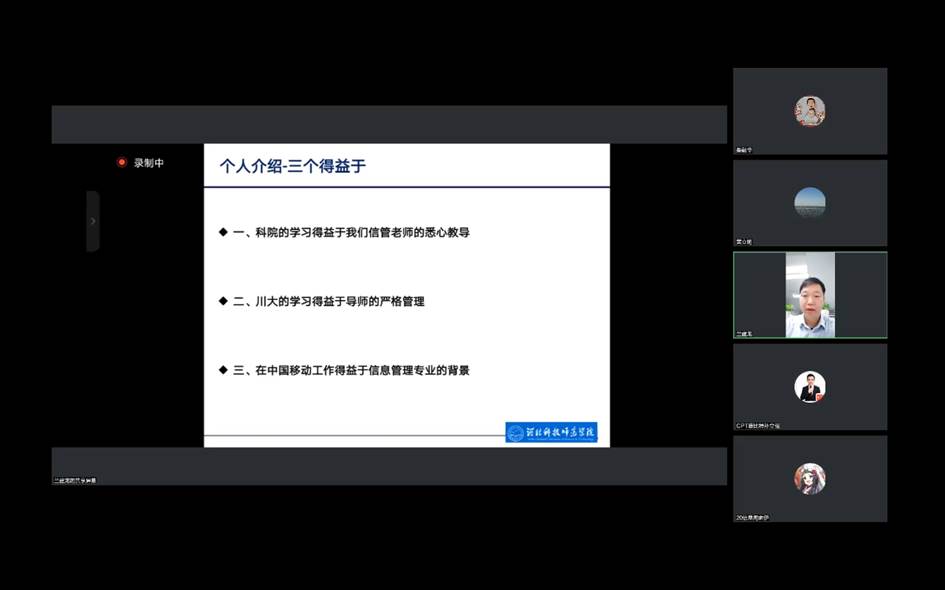 2022年10月19日-23日,根据西西一级AAA片婬片免费领导班子的安排部署,信息管理教学部组织开展了3场共计7人的优秀校友系列讲座。西西一级AAA片婬片免费黄立明院长、刘海滨副院长及信息管理与信息系统专业教师全程参加了讲座。系列讲座在学生中反响强烈、影响深刻,学生们纷纷反映获益匪浅。