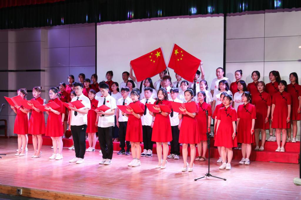 同颂会开场的诗朗诵《建党百年颂》铿锵有力、细数中国从觉醒到富强的百年历程,展现了不同时期共产党人的初心使命和责任担当。紧接着学院全体教师表演唱《没有共产党就没有新中国》和《中国》,展现了昂扬的精神状态和较高的演唱水平,引领同学们在激昂的旋律中回顾党的伟大历程,激发奋进力量。随后,各专业和相关教学部师生组成表演团队,精心设计,精彩演绎了规定曲目《岁月征程》和自选曲目《中国》、《我们都是追梦人》、《骄傲的少年》、《大中国》、《少年》等,歌颂了中国共产党领导下,中国的革命建设历程和改革发展成就,展现了工商师生理想坚定、奋发图强、勇于拼搏的勇气和决心;最后,学生党支部党员们饱含深情地表演了舞台剧《红梅赞》,引发精神与信仰的思考。同颂会在《歌唱祖国》的合唱声中结束,师生挥动着手中的五星红旗共同祝愿伟大的祖国繁荣富强,为党的百年华诞献礼!歌声嘹亮,余音绕梁,现场气氛再次被推向高潮。