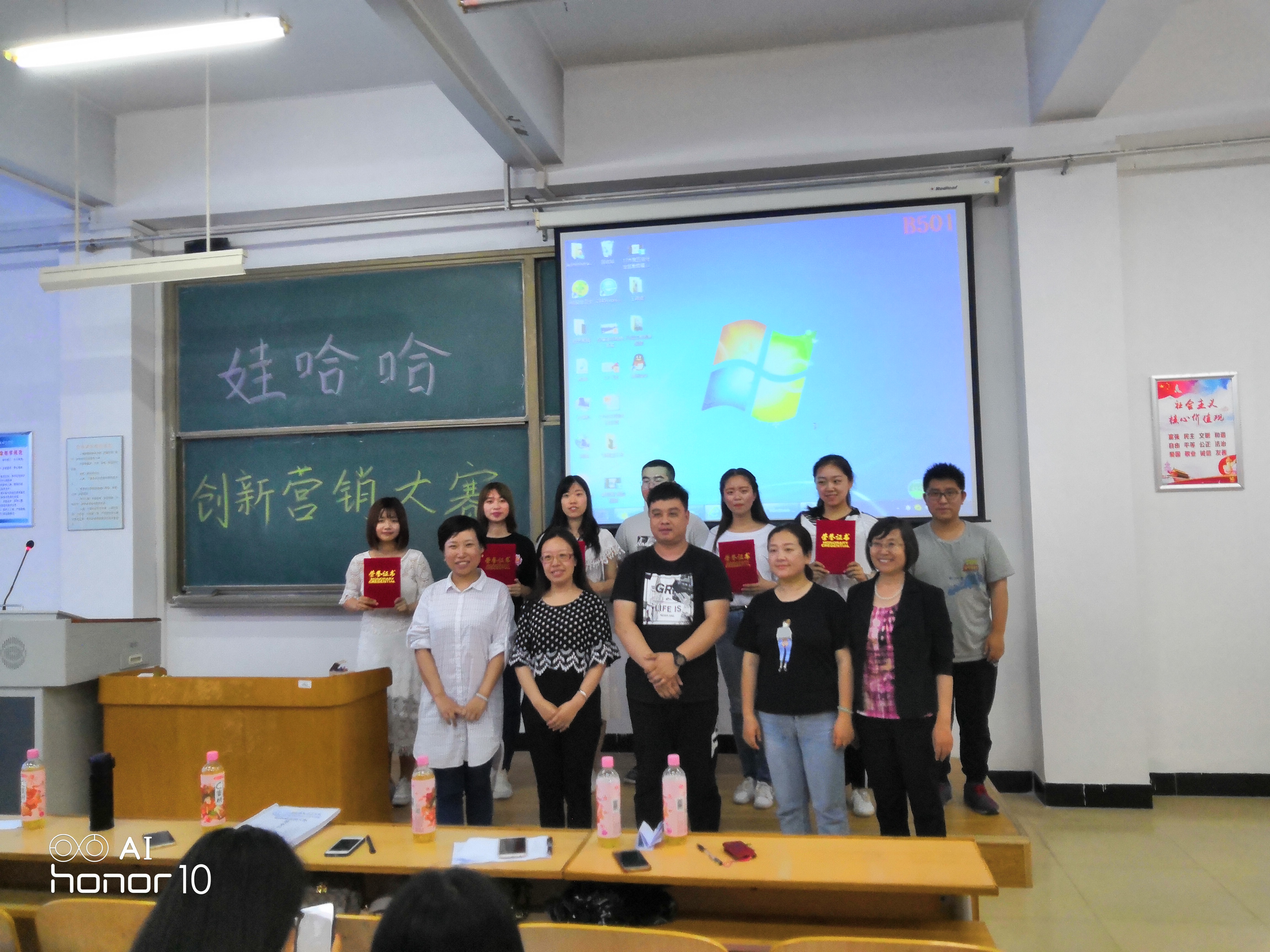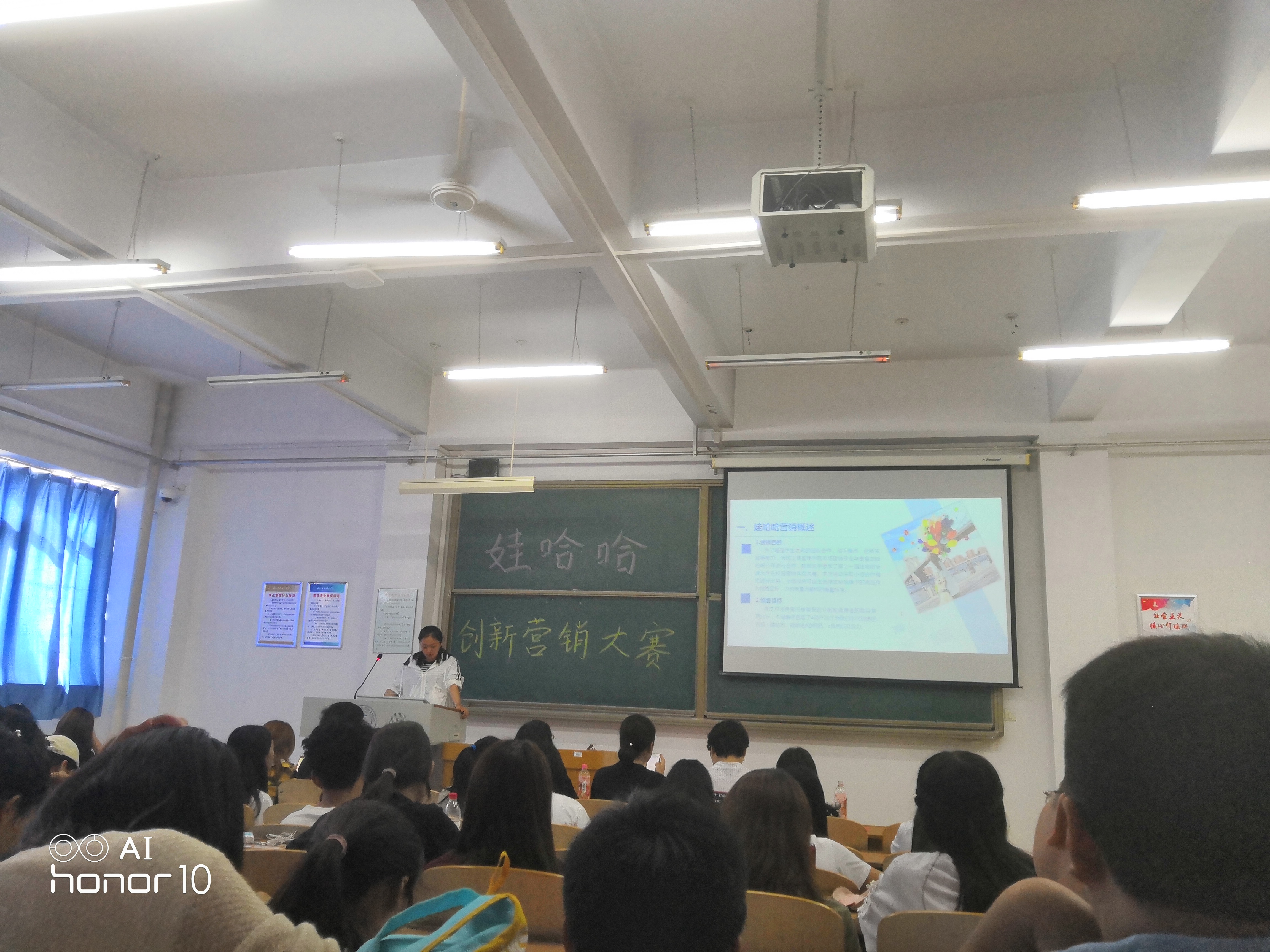 此次比赛为我院管理文化月系列活动之一,历时一个半月。决赛分为两个环节进行:第一个环节是娃哈哈营销创意的展示,各组在大屏幕上展示自己的营销创意视频;第二个环节是PPT答辩,各组代表于台上展示并讲解自己的营销过程、创意及对此次娃哈哈营销大赛的见解与体会。最终成绩按照营销策划书成绩25%、创意展示及PPT答辩成绩75%的办法评选出一等奖1名,二等奖2名,三等奖3名,创意奖2名,并进行现场颁奖环节。